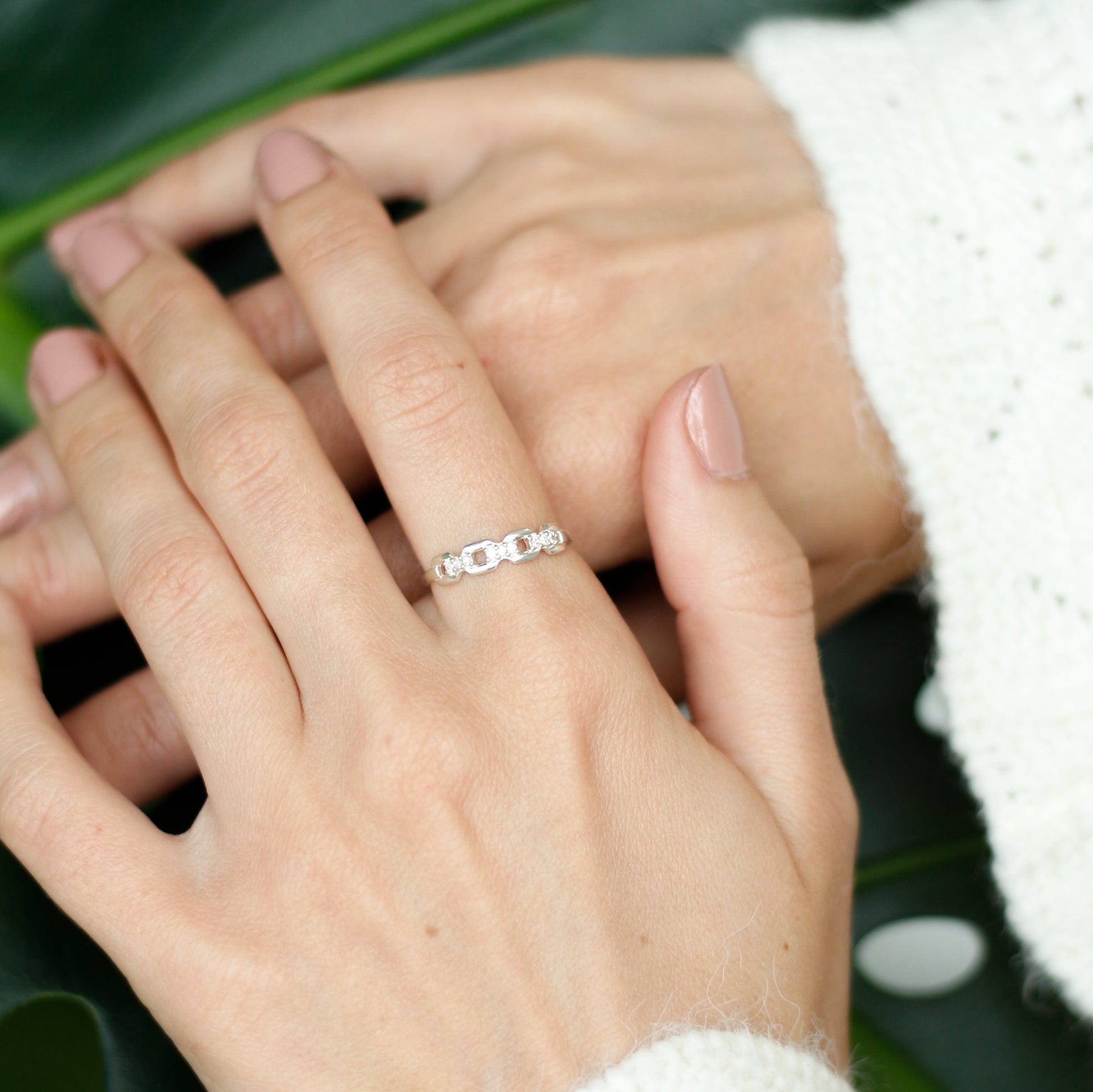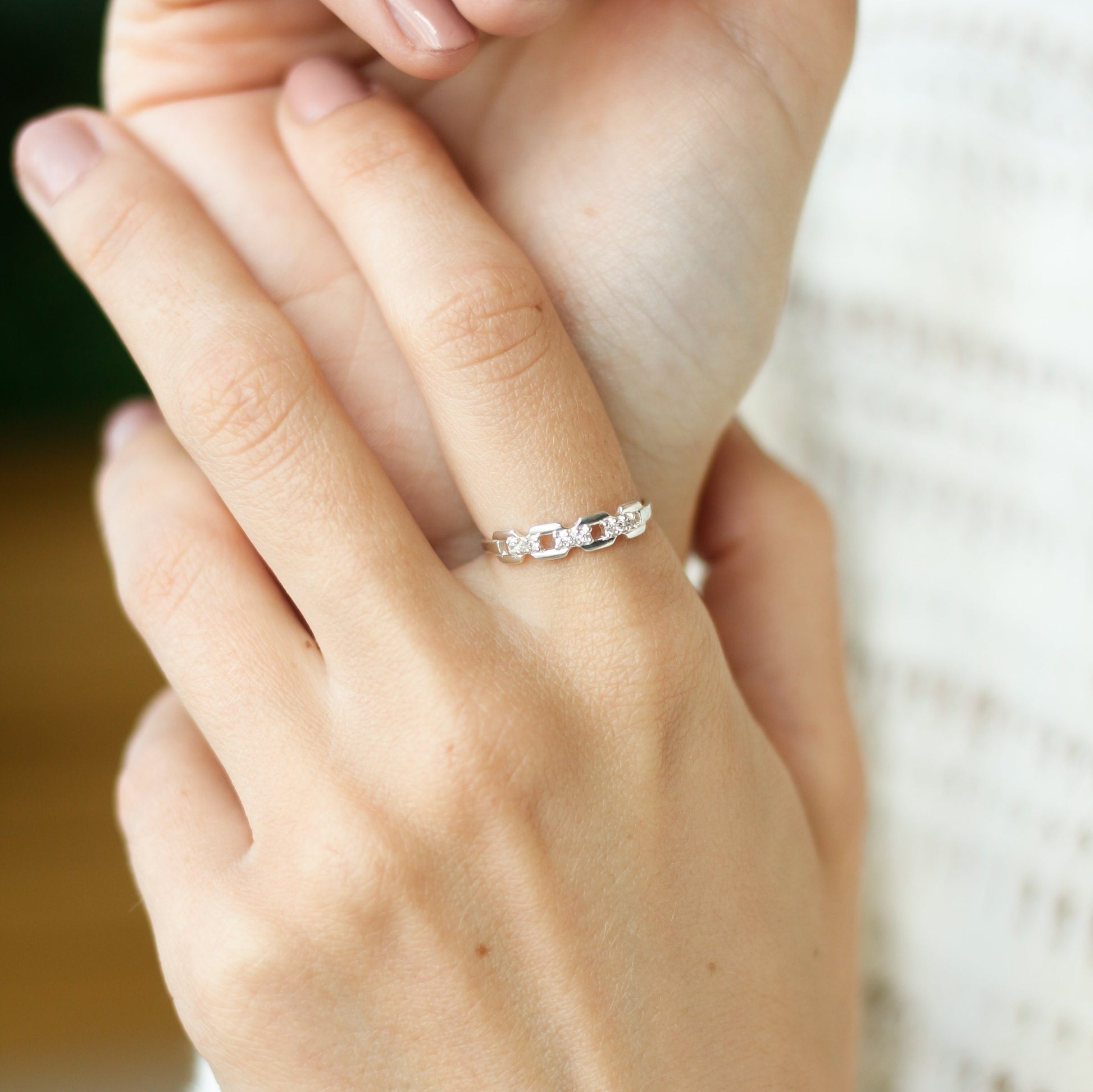 Chain Ring with Cubic Zirconias is available in 925 Sterling Silver, Silver with 18K Gold Finish, and 14K Solid Gold.