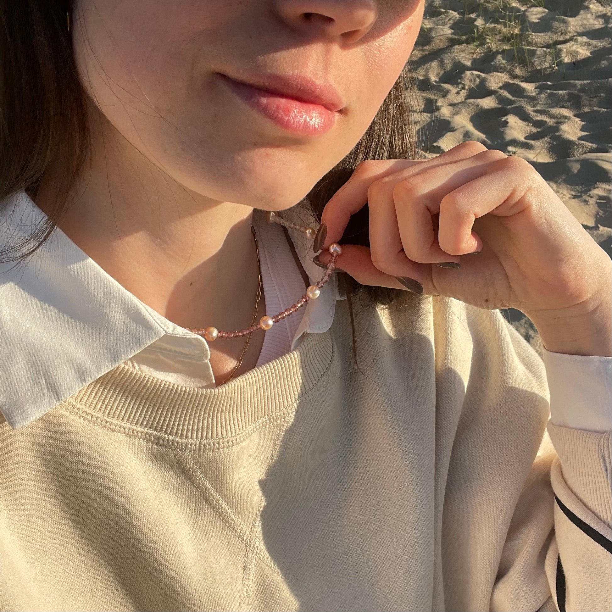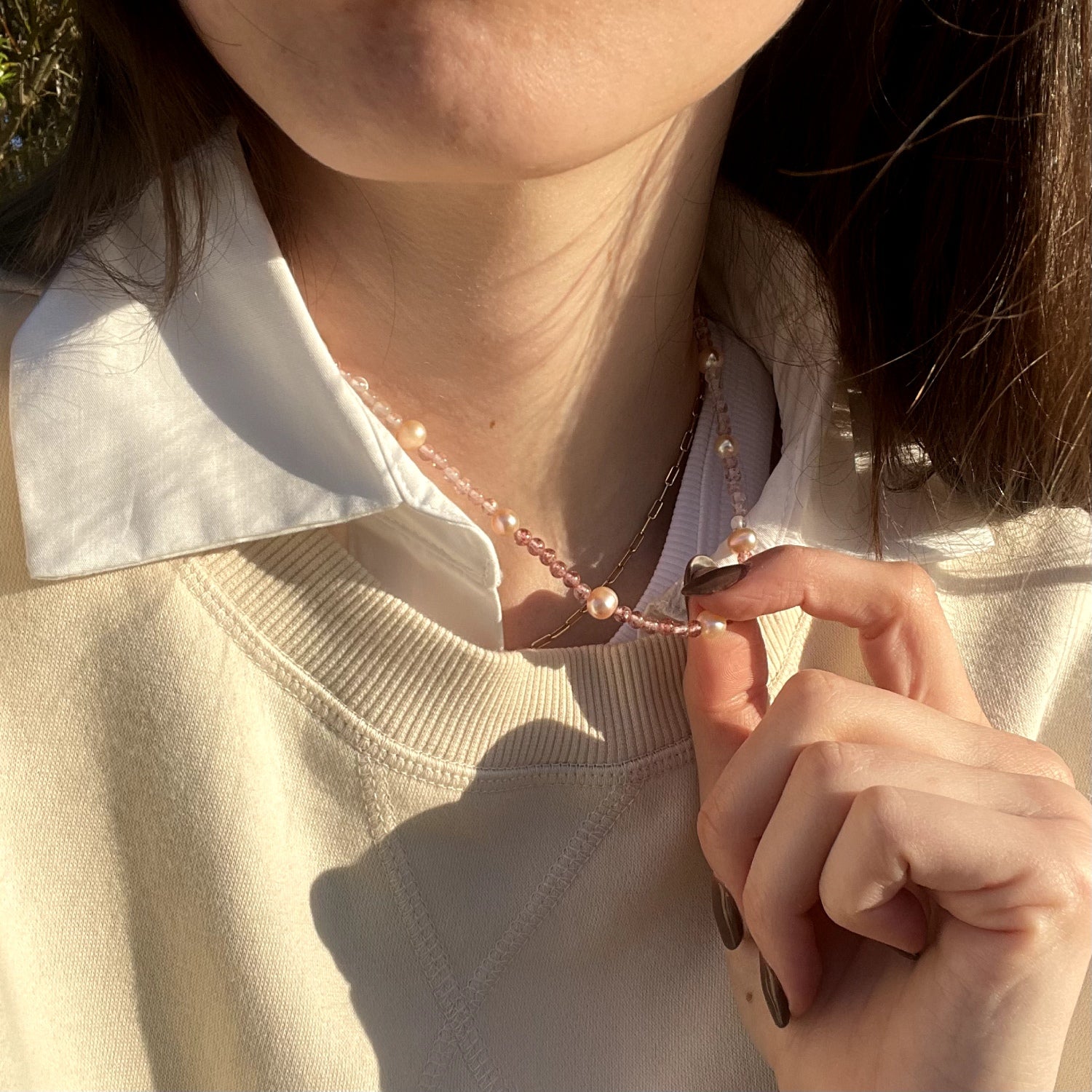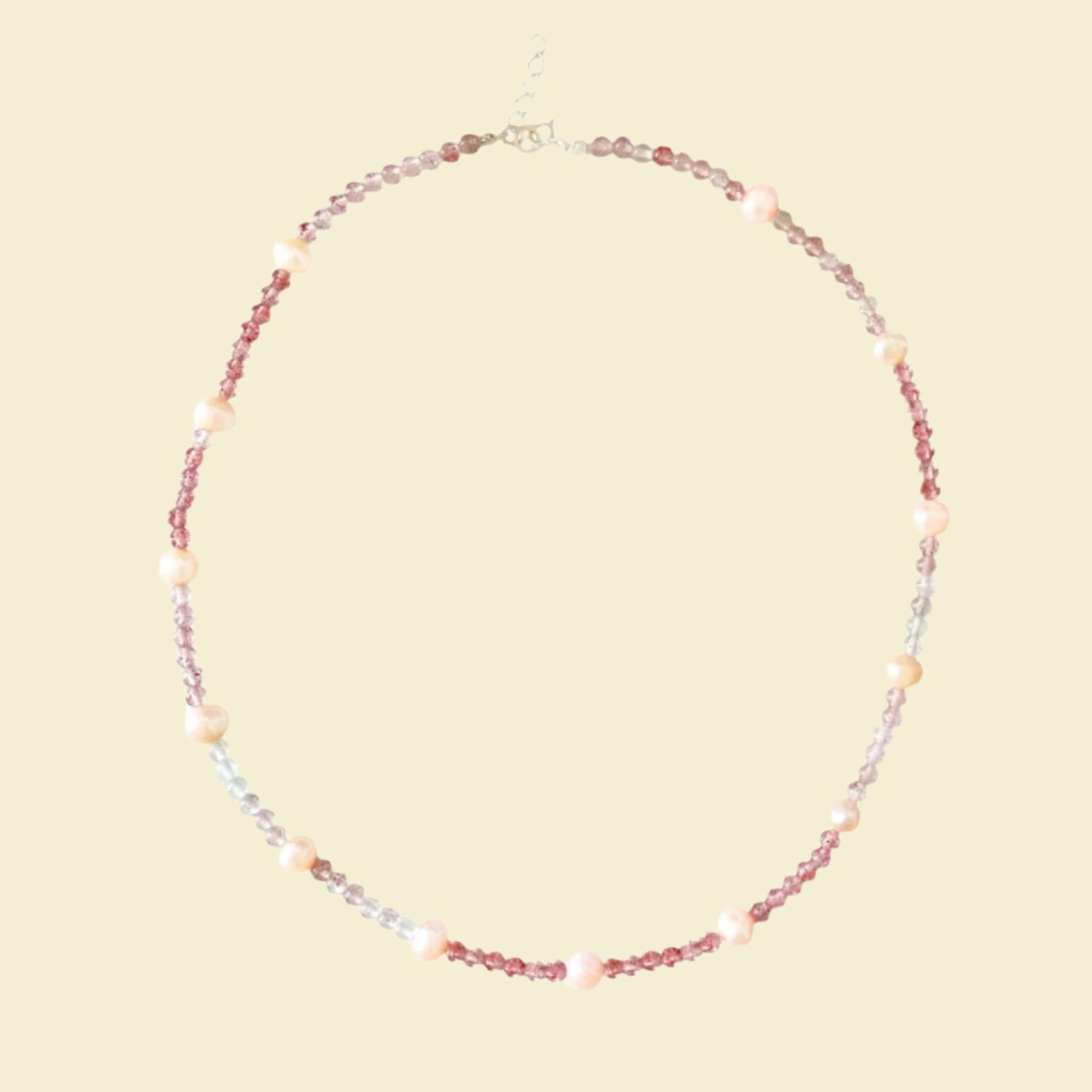 Our Strawberry Quartz Pink Pearl Necklace is made with 925 Sterling Silver closure and pink natural freshwater pearls. The necklace comes with an extension as well.